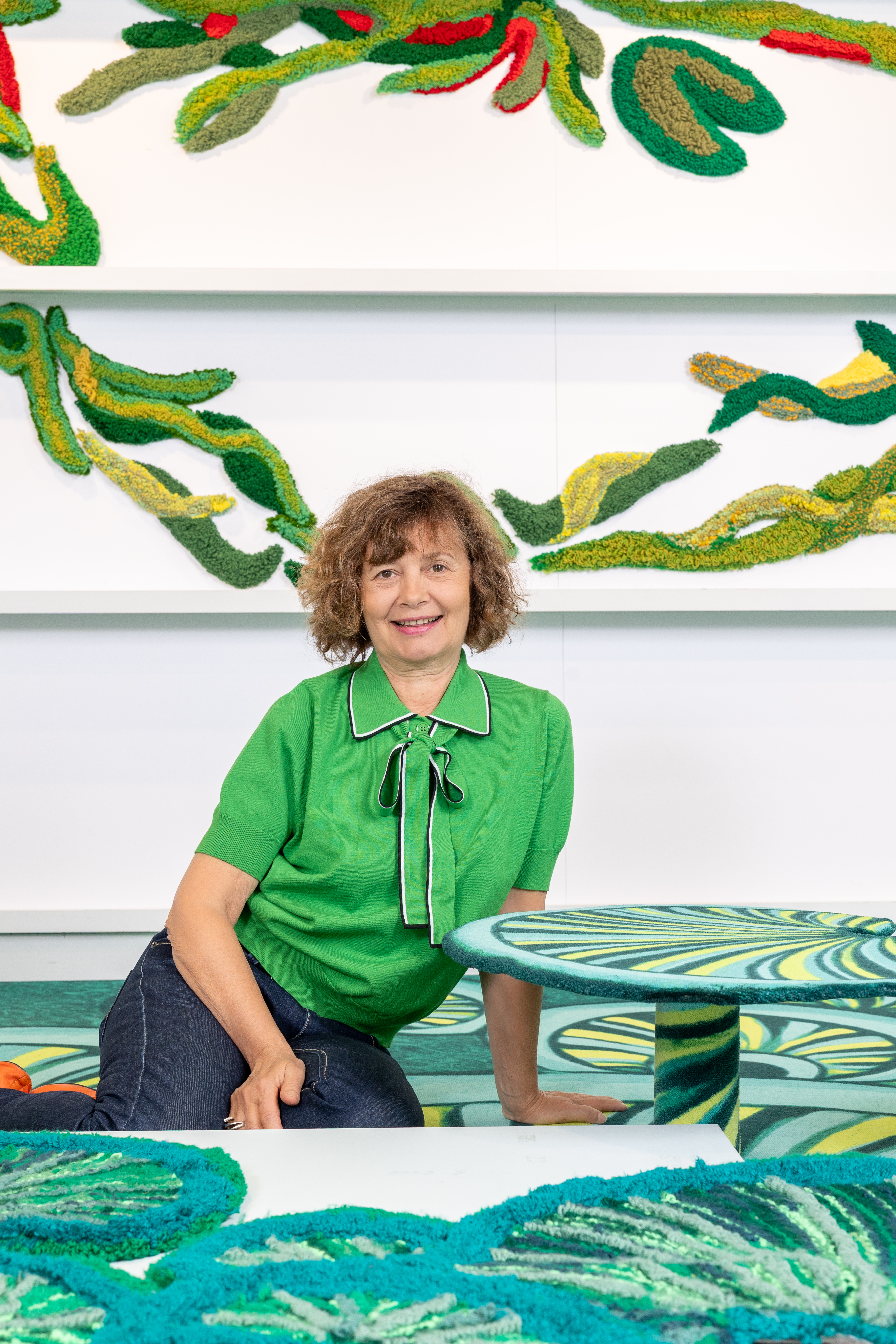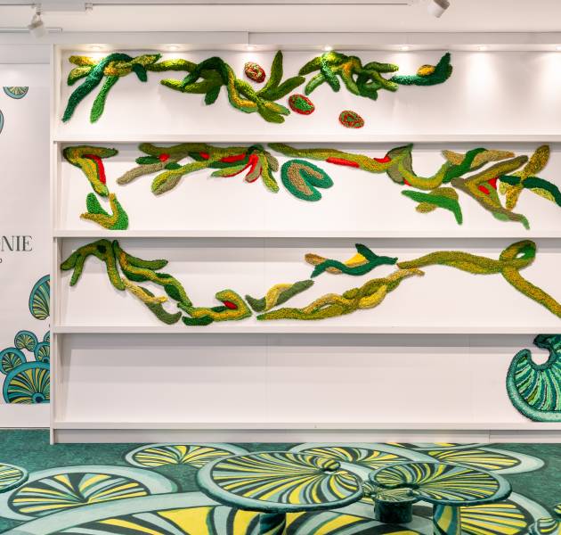 En el suelo, los nenúfares coloridos del universo Funky Fungus se despliegan en intensos tonos verdes con toques de amarillo neón, evocando las ondas de un agua misteriosa. Algunos emergen en relieve, mientras que en las paredes, las Folles grimpantes se elevan como lianas textiles, insuflando una vitalidad orgánica. En diálogo con ello, la serie pictórica Arrières pensées establece una conexión sensible entre la pintura y la materia textil.