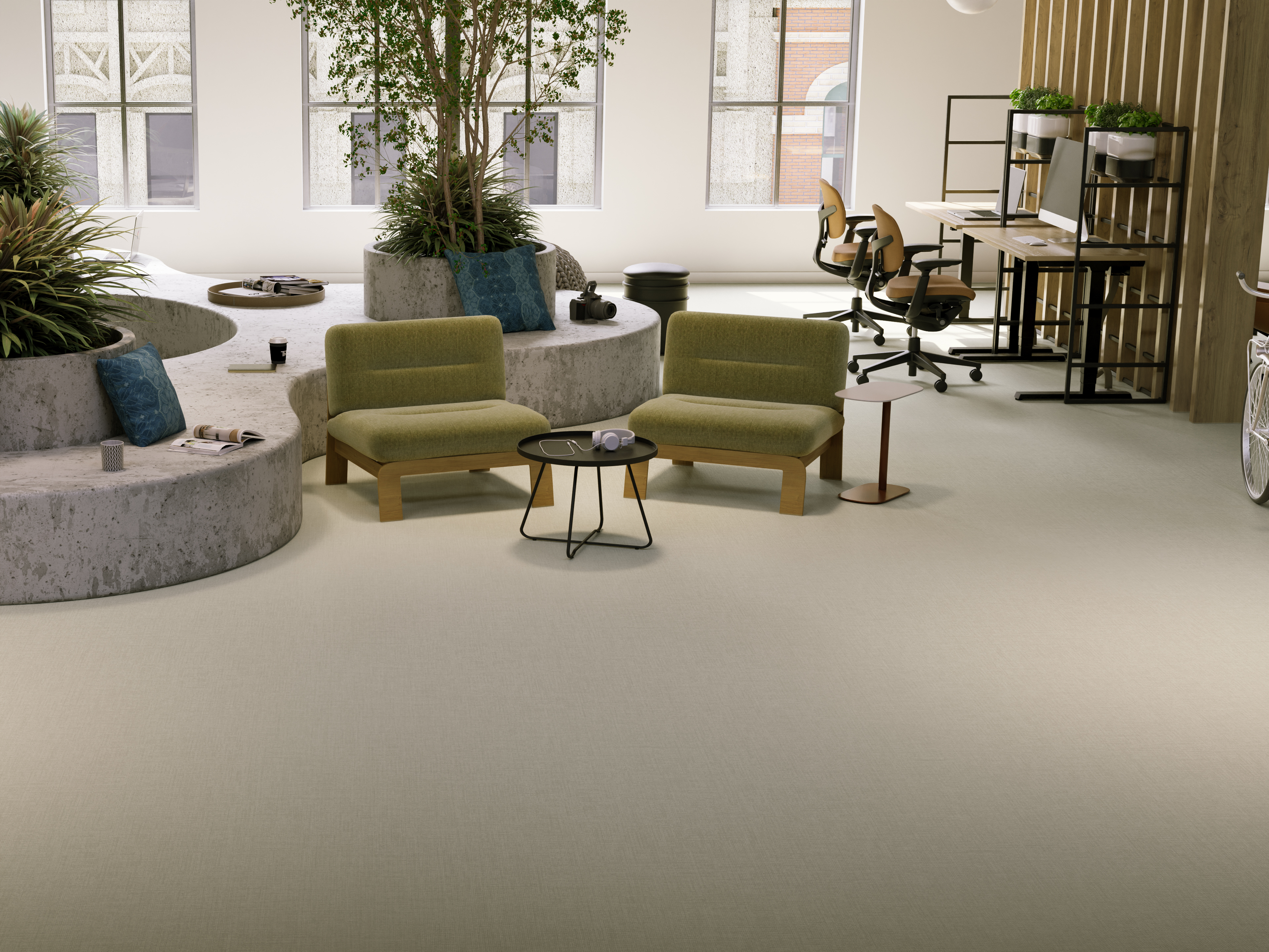 - Los suelos LVT (Luxury Vinyl Tile) son por naturaleza suaves y cálidos, ya que tienen la ventaja de absorber el calor ambiental mucho más rápidamente que un suelo de piedra. Cuando se despierte, podrá pisar con los pies descalzos las moquetas Balsan y pasar del dormitorio al cuarto de baño sin temer el frío del amanecer. Por la noche, se reencontrará con esa suave calidez después del trabajo y disfrutará de su salón en un ambiente delicado. Este mismo confort se extiende también a los espacios de oficina, donde contribuye a crear un entorno acogedor y agradable a diario.